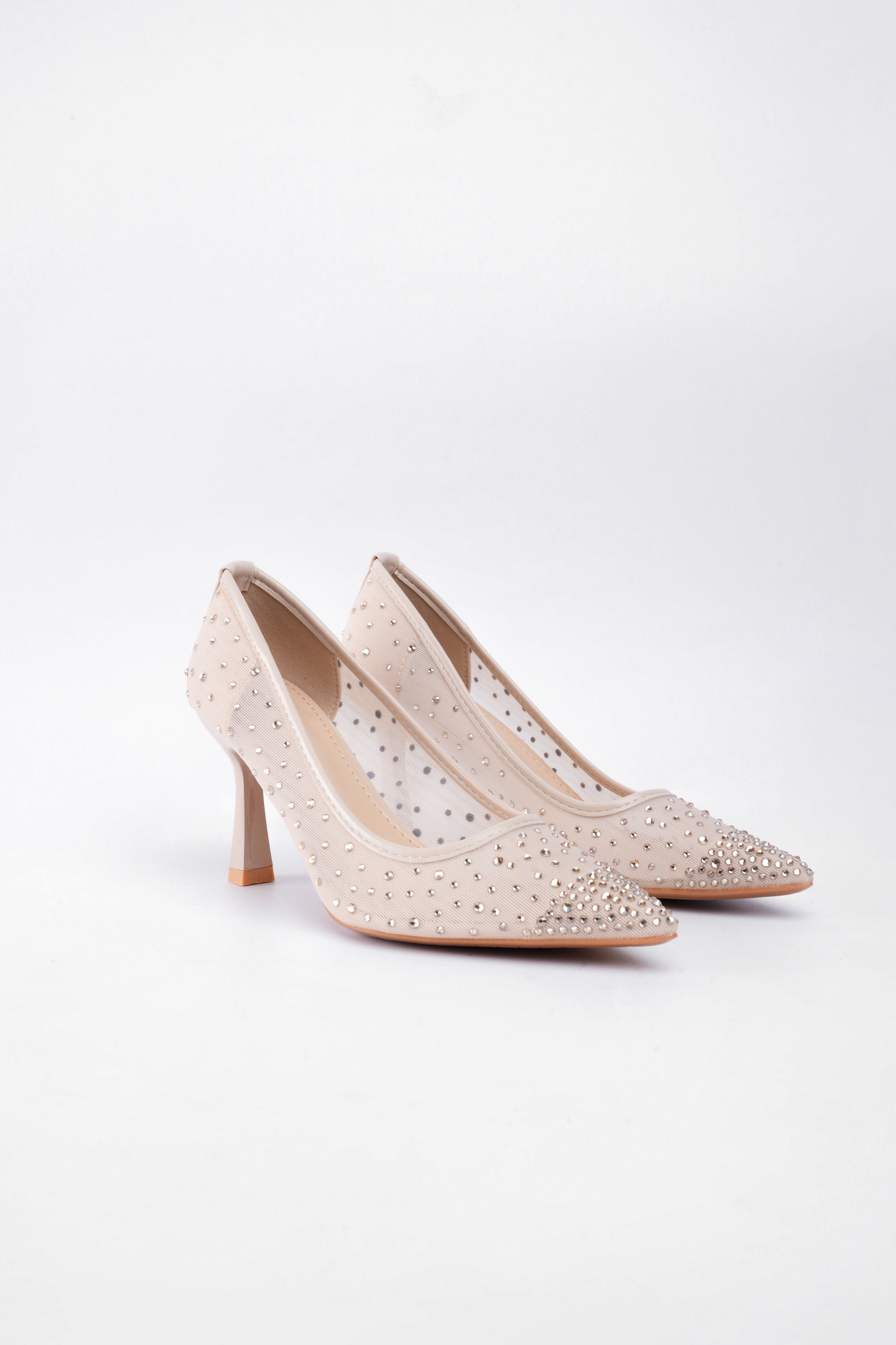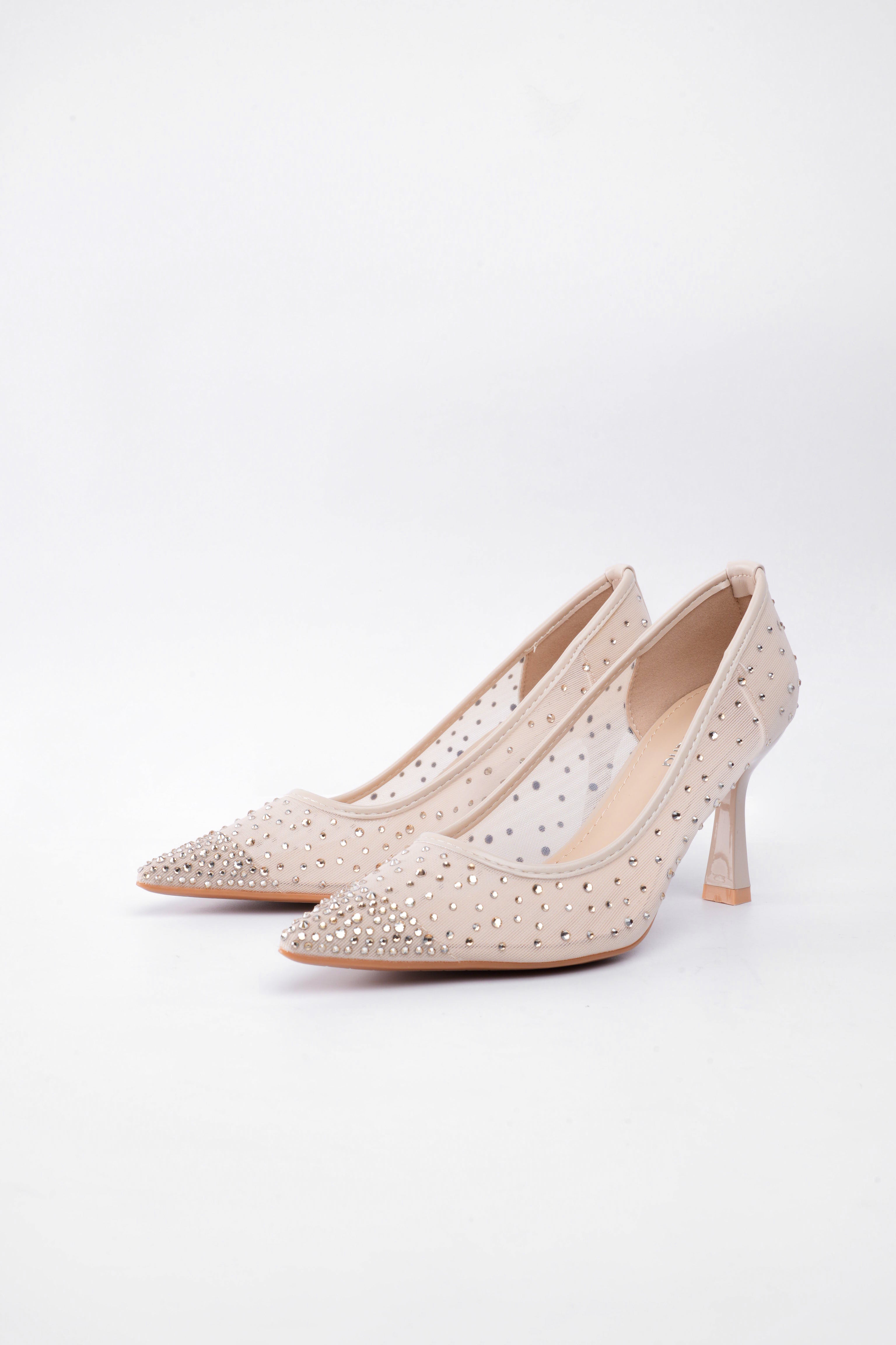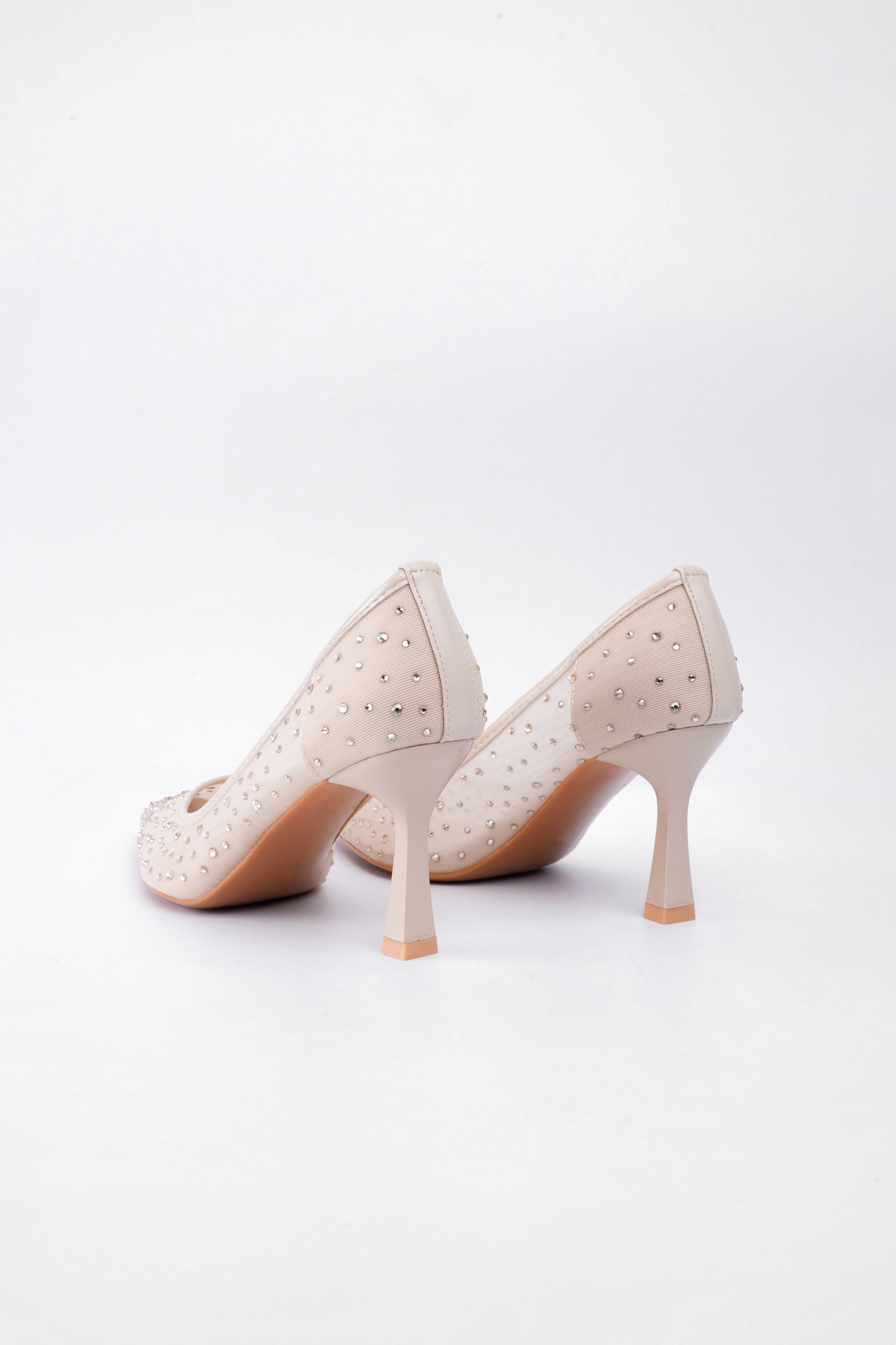 TACÓN TRANSPARENTE BEIGE APLIQUES PLATEADOS